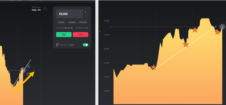 最初は水平線トレードで行ってください。 なかなか鉄板です。どのくらいかは、水平線をどのくらい抜けたか、相場の環境などで変わります。 自分で検証してください。 ![]() 抜けそうになれば、50秒で3分バイナリエントリーすれば、勝てます。 慣れれば抜けそうになれば、1分エントリーすれば次の足までの勢いで勝てます。 慣れたらトレンドラインも、バイナリトレンドラインも引きましょう。 |