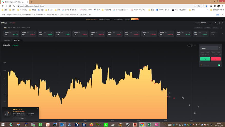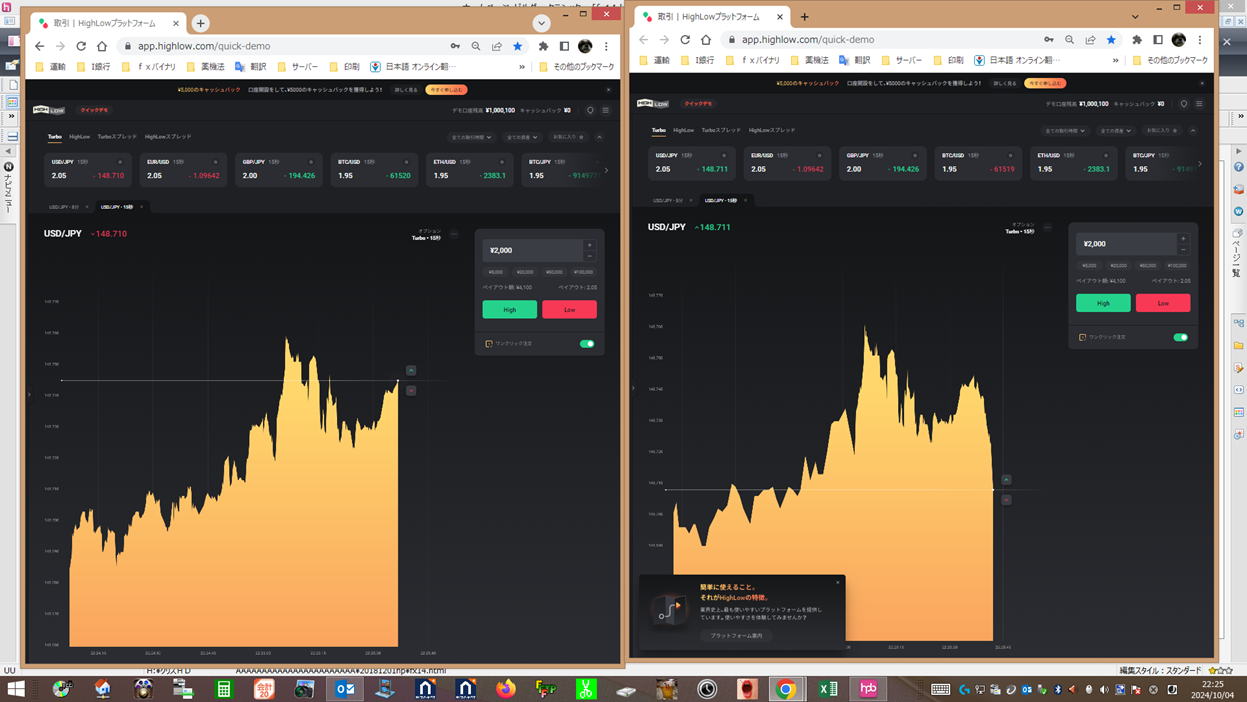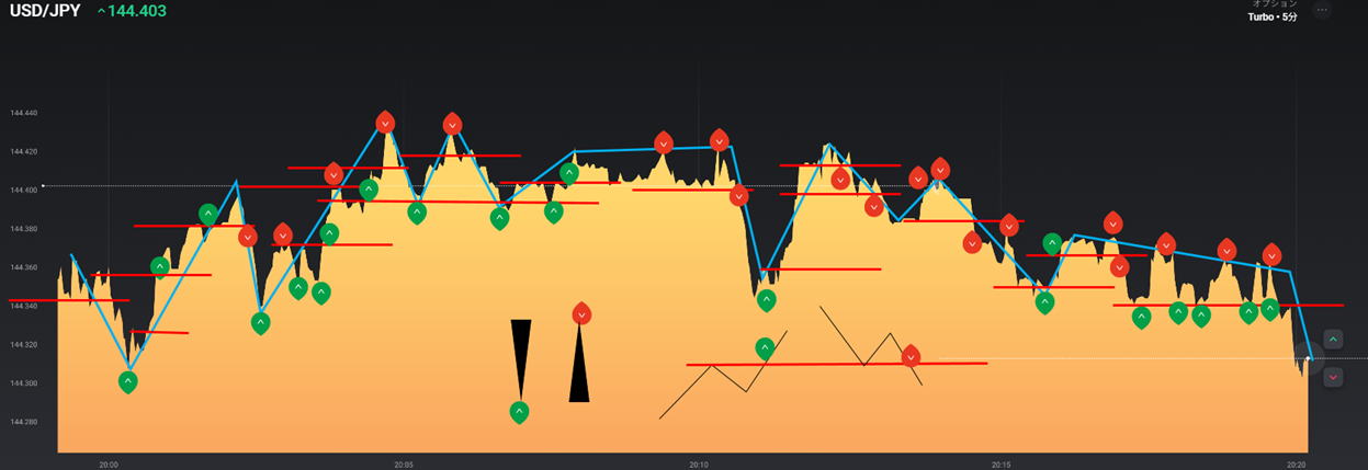 | 勇気 | 勇気を出してエントリー 負けても引き分け 下げ相場でもっと下がると思ってLowエントリーしたが、いきなり反転しまったら逆に打ちます。 (パターンを見れば上げ1下げ2なのでやばいんじゃねーとお叱り受けそうですが解説なのでお許しください。) 勝ち負けでも200円儲かります。変な感じです。 負けちゃっているので2発エントリーするかどうかは練習して決めてください。 悪意があればペイアウトは2.05なので同時にHighLow打てば差額が絶対に200円は儲かるはずですが、 こればかりやると、常識的に反則技と認定される可能性が高いので気を付てください。 以下の場合はLowエントリーの赤マークはグレーになりますが、見ずらいですので、分かり易いようにLowエントリーを赤く表示しました。 勇気じゃないですね。損しない技です。 あまり離れますと打止めた方が良いです。後打ちしたものも負けてしまう可能性があります。 エントリーして3秒以内と思ってください。 ![]() 下げ相場では、噴きあがったところでLowエントリー 上げ相場という根拠でやるのでフラットの所でやれば死にます。 ![]() |