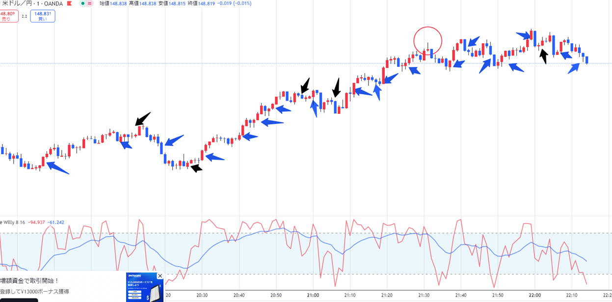 | ダメなのは | 遅いということです。15秒は2秒位のチャンスしかないので考えず、エントリーそれでも迷ったら 30秒1分3分のラインチャートを出して環境認識します。どこかにラインが見えてきます。 中途半端なくさび狙い くさびは狙ってエントリーしませんとそこでエントリーできません。よってくさびは無視します。 ただフラットな相場が出ればくさびが出たらエントリーしてやろうとなりますが、まあ約定拒否になって外れた場所でエントリーが関の山で失敗します。 それより安全性の高い場所でエントリーしましょう。 くさびが横ずれかちょっと上がったらエントリーできます。0.5秒判断で反射的スキルが求められます。慣れないと無理ですかね。 されど、人間の要望が深いので、フラットになったらくさび待ちでHighLowを予測してタイミングよくエントリーしてください。負けそうになれば 反対に連続で二発エントリーしてください。この手法はお薦めしません。反対も負けると3発負け なんでもかんでも15秒も良いですが環境認識できたラインチャートでエントリーしてください。 ![]() 過去検証コアタイム以外の時間 ボラが3くらいじゃないと階段が3段階にならないので注意 細かいロウソクが連続していると意外と勝てます。 ![]() ![]() コアタイムでやってください。 レンジトレンド相場 ![]() ![]() レンジっぽい場所で00で始まった流れは40秒で反発があるので注意してください。ひげがそれに当たります。 よっぽど慣れないと時間00まで見れないと思いますが、 完全レンジ 二段階を待っていたんじゃ勝てませんので初動の一段目でエントリーするしかないです。プロでも難しい ただひげがあればあれば次の動きは順行するんですが滑ったら地獄で負けるんです。 瞬間的にタイミングを考えて3分から1分に変えてみてください。。長いと戻って負けます。勝っても50%でこれでも良い方です 職人技のある方ならこのように勝つでしょうが、 まあレンジは抜けるまで待つのが基本です。静見するしかないです。 ![]() |