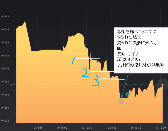インディージョーン作戦&ライントレード トレンドを制覇しよう。少なくても2分あれば勝てます。順行から反発したところを逆張りします。 なだらかな順張りチャートでは、順張りでエントリーしてください。ここでも大きくはないが少し凹んだり凸ったりした瞬間にエントリーする練習を兼ねてください。 手法 ①5分ラインチャートでトレンドか崩れたところを探します。 綺麗ななだらかな完璧なゆっくりとした坂道はないでしょう。多少凸凹でもOK 崩れる所は、基本は水平線ブレイクですが、一般チャートやRSIで探してもいいです。 目安はお椀の形です。お椀のヘリあたりです。一般ロウソクチャートだとレンジブレイクです。 簡単に言えば肩が下がっているか上がっているところです。 チャートなら同じ色のロウソク軍団 ここでは一般チャートを出していますが、慣れれはハイローの5分で十分です。パターンも見て時間幅の検討も付けます。 終わった図ですが参考にしてください。 ![]() ![]() 長いトレンドの方が良いに決まっていますが、その選び方は後で記述します。 ⓶15秒画面に移ります。 ライントレード ラインを意識してブレ戻りを狙います。 赤Lowエントリーここで坂道がなんとか形成されていれば、勝負します。15秒続いた坂道ラインチャートは、30後まで続くので 細かい利食い反発でピョコンとなったところで順行エントリーすれば、勝てます。 実際にはぴょこんと上がった瞬間にエントリークリックしないとエントリーできないので練習してください。 滑ることもただあります。 最後は、ぴょこんと上がってそのまま反発すれば負けますので、しばらくお休みします。 ![]() ③エントリー 理屈は下記の通りです。ぴょこんと上がった下がったとしても短くも長くもトレンドは続くので もとに戻る癖がありますのでそこをそれに追随するんではなく、逆に順行すると見てエントリーします。 教科書的なイメージ =>実際は![]() 最後が負けるくらいじゃないとダメです この手法は慎重になればなるほど負けます。 理由 負けパターン 図11.12 ビビッてるとエントリーしない トレンドが終わっちまうぞと思いきや、ようやく、最後にここぞとエントリー、これじゃあ負けに行くようなもんです。 慎重もくそもへったくりもないんです。 図ではポイントがかかれていますが、これては後からの分析で、教科書の世界です。こんなうまくいくわけもない(時々その通りに行きますが) 上手くなれば、最初にエントリー一回二回しておいて、45秒後には様子見します。 先行逃げ切りが必須です。 長いトレンドだろうが、短いトレンドだろうが、15秒画面ではせいぜい勝負できる時間枠は1-3分程度です。 長いトレンドだって上下しますので、勝ちパターンチャートが出現する場面が、出たり出なかったり、呑気にだらだらエントリーはできないもんです。 最後は、負けると分かっていてエントリーしていかないと先行型人間になれません。この訓練は人間の本性と逆行するので 修正するにはよっぽどの訓練が必要 図10 階段タイプ 深夜でボラがないと階段のステップ部分が長いのでと負けます図11.12 起伏の激しい上昇では遅れると負けることもあります。 お椀を意識して売りもエントリー瞬間ドカン&ピョコン・ボッコンのくさびノイズ 深いくさびは、反射神経的にエントリーできません。浅いくさびは、できないこともない。待っていればできます。でもいきなりは無理 ドカンのズッコンタイプ 90度で上下する時は一瞬なのですぐに戻る性質=>その後![]() 1番底を見逃して、たまたま2番底でエントリー 勝ったけど本当はダメ |