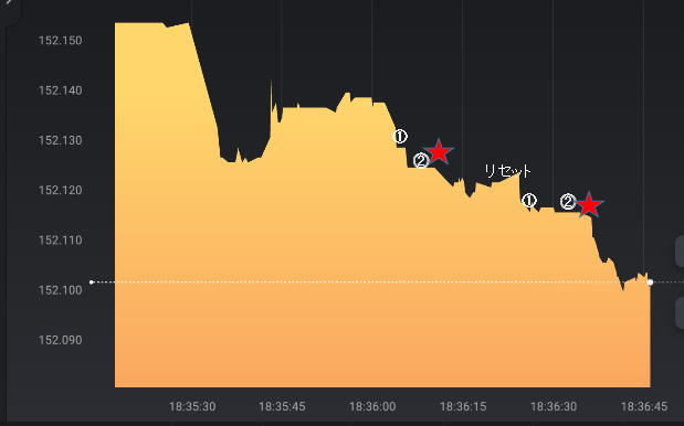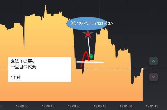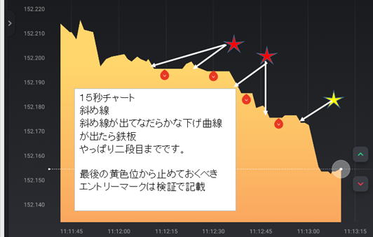 階段① 階段⓶のエントリー 画面を見てラインチャートが階段状になっている時だけ有効です。なだらかな半月円のようなゲレンデなら最高で連打しても良いです。 水平ラインから階段状に進むと平らなところができる。V字でもOK これを①としさらにその次のの階段⓶で15秒エントリーします。 ラインが逆行したらリセットします。または水平に10秒動いてもリセットして⓪に戻ります。そこから①⓶として⓶でエントリーしていきます。 ⓪と①と⓶は、ダウブレイクして水平線で引くと落差があるのが条件です。 まあ、難しく考えないで、順階段になっていればOK 上げも下げも同じです。 ③もあるのですが、反発でよく負けるので③ではエントリーしません。1分でもバタつきがないなら誰でも①⓶で勝てます。 バタつきがある相場では①が出ても⓶が出ません。 ③でも④でも勝てそうですが、きれいにゲレンデみたいになっていればエントリーしても勝てそうです ![]() これはまだいい方です。上に膨らんだブレでエントリーしてください。下がってつられてエントリーしますと負けます。ロウソクチャートは上ひげから始まる陰線の連続 上ひげ陰線で次も陰線なら代チャンスと言えます。 こんな感じの階段が出れば万歳です。いつ来るかは分かりませんがあせって連打しないでください。 連打をするなら先にエントリー 後からの連打は70%負けるんです。連打しようという気持ちって最後にでるすけべ根性のような物です エントリーマークは検証用イメージ本物は一個あります。 30秒エントリーです。反発が大きい山なので15秒じゃ負けそうです。15秒でやっていると30秒は遅いと感じます。 上くさびを狙うんですが、Λのピークで狙うのは不可能なので上に行ったらLowエントリーします。そのまま上に行けば逆噴射2発して 負けを取り戻せばいいです。 じっと見てるんじゃなくリラックスして同化してエントリー 練習しても難しいです。 チャンス降臨左側 調子こいてエントリーするとΛで負けます。 上昇トレンドだと⓶から伸びる 。![]() ![]() 15秒10秒だけの神降臨 大きく行ってしまった場合はエントリーは、①でエントリーすべきですが、時間的反応時間的に無理なのでパスします。 エントリーしちゃいけません。 ![]() 下記のような大きなぶっちぎりのくさびになれば⓶でエントリーはできないってわかると思います。瞬間反発で反応できないです。 ![]() ![]() 実戦で使えない無理な検証はしません。 ![]() 階段になっていないのでダメです勝てません ![]() ハリネズミ 5分だと階段のようにも見えますがハリネズミですね。エントリーポイントの見つけ方 5分で見てパターンを見つければ後は30秒や15秒に移って目標ポイントまで我慢して①⓶でエントリー 左5分見て右15秒や1分でエントリーしていきます。大きいぶれから①⓶がありますね。 上下ヒゲ 00から下降し、15秒でリバウンド 通常の3倍の下落のあとリバウンドして来たら即エントリーすると勝てます。 ![]() |