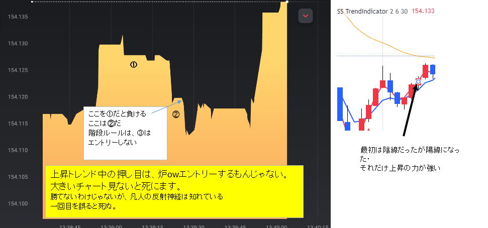 15秒チャートに移ります。![]() 図には書いていませんが、水平線を利用すれば、最後の負けた位置が今度はHighエントリーとなります。 単発1分でもインディー坂が出ます。せいぜい一回エントリーですが・・・・ ![]() 理想のチャートですがこのような綺麗なインディー坂はめったに来ません。 ゆっくりですがトレンド一回目の階段で反応するのは難しいが、上げと下げでセットで認識はできる。よって二回目を狙ってエントリー 3段目でエントリーすると死ぬんです。 15秒エントリー 一分の陽線でも後半は反発があると思うべし。30秒後は様子を見よう。ずるずる上がれば二本連続階段がでる。ドル箱相場、でもここは案の定下がって来た。様子見てよかった事例 シンクロ この相互の感覚をつかむには画面をいつも同じ大きさにしてください。 薄い縦筋で計算できます 5分チャートは約18分 15秒チャートは、1分30秒程度 うまくシンクロして流れが出れば勝てます。 レンジでもオリオン座になっていれば、勝てる時もありますが、あえてレンジで勝つ必要があるかはご自身の判断です。 ![]() ![]() |