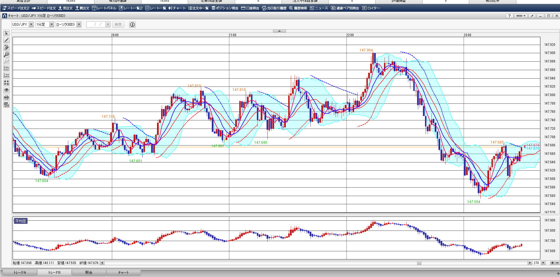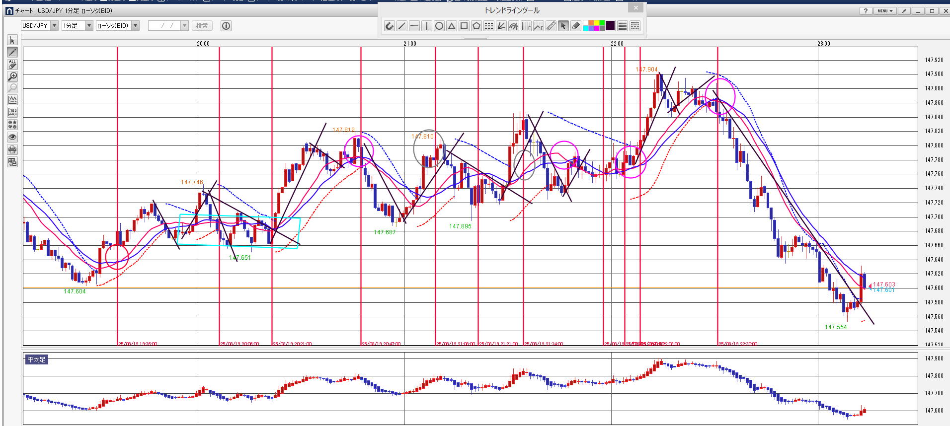 右半分はだめですね。一山5本でしょぼいです。左のような感じになるまで待ちましょう。 急上昇急降下のトレンドでは、平均値がずれるので、効果がないのでやらない。 3.トレンドに逆らわないエントリーをする。 15本線を見て上昇の時はGX 下降気味ならDXを使って片道切符で行く。伸びしろがでます。 大きい山ならいいが、薄い山なら往復トレードは、うまくなってもそれは錯覚であり、やらない。 (下降トレンドなのに買を無理に入れるとドカンというひどい目に合う。) 4.クロスが起きそうな前に意識し、ライン等の線を引いておく・・・損切や追撃の準備 5.RSIの位置を確認 ○上昇なら50%以下とし、下降なら50%超の時とする。 ○上昇モードなら50%のラインを越えても結果OKの場合があるが確率は下がる。 6.GXDXのそのキャンドルが次の足でエントリーする。 7.デッドラインが来たら終わりにするのが基本だが・・・・ 前の1時間の中の山の高さを見ればどこまで上がりそうなのか見当がつきます。 トレンドができたらロウソクや自分で敷いたラインを参考にして手じまいを探る。 三本桜がでたらロングでとことんホールド 最後の山の上昇斜面の中腹まで来たら終了する。 補足 前の足も含めて2連勝であると確率が上がる。(順張り傾向) そうでない場合は、2本待ってクロスのロウソクに比べて順張り順行になるまで待ってエントリーします。 RSIの位置は上昇なら50%以下とし、下降なら50%超の出現率だが、 この出現の70%以上の確率ですが、買いなら50%超、うりなら50%以下でもこのサインは出ます・・・だいたいそうなりますが、違う場合もあります。 なぜ当たるのかを検証するとすでに小さいトレンドが確実に始まっているからです。これに偽りはありません ロウソクで見れば3~4本遅れる時もありますが、その分は損していないが損した気分です。 また、だましに合わない確率も高くて安心感 欠点 レンジは通用しません。 信号が遅いことです。平均線はなんだか二テンポ遅れます。 後書き いろいろ考えますと考えているうちに動いて失敗したということもあります。 人間は不思議で損したくないという気持ちが働くので、正しい道をはずれる場合が多いのも事実 逃がした魚は大きかったというのは、思っても言ってはいけない。 実際に検証してみた。 下図を見ての通りです。 RSIとの関連性が濃厚なので検証してみました。 買いなら50%以下 売りなら50%以上してます。 50%超でも上昇のGXが出ていますが大した伸びにはつながっていませんでした。ピンクの線です。 しかし、上昇トレンドでは、RSI50%以上でも起こりえます。 そんな時は直前のラインの向きが目指す方向であれば行っても良いと思います。 最後の売りシグナルでは、4本4分待ちました。 真ん中にもGXが出ていますがほぼ50%のRSIラインなのでここではパスしています。 次に2本の線はまっすぐに平行となります。ここはポジションキープです。 RSIの数値を変えればいいのかも知れませんが、MACDの方が簡単です。 ![]() 2012/1/22の朝の相場 9時から10時30分の間で3回チャンスがありました。 ![]() 狭まってきました。ここでいったん売っても良いですが この後は以下の通り 踏ん張りが大事 利益確定も良いですが踏ん張る勇気 あああー勇気がなくてなくて、売ってしまいました。 でももう一回チャレンジしました ![]() その後 ![]() 是非ご自分でも検証して活かしてください。 大きくもうけるには追撃が必要ですが初心者は、やたらと追撃しますと甘くなるのでほどほどにしてください。 ボラの無い相場20200122の夜間 ![]() 実際には細かく買えないしスプレッドもあるので大きな山か谷が形成されるのを待つに越したことがない。 その後 ![]() のぞましくない動きですね。 17:30からと22:00から動いた感じがします。 うすっぺらい検証です。 |