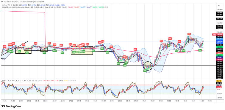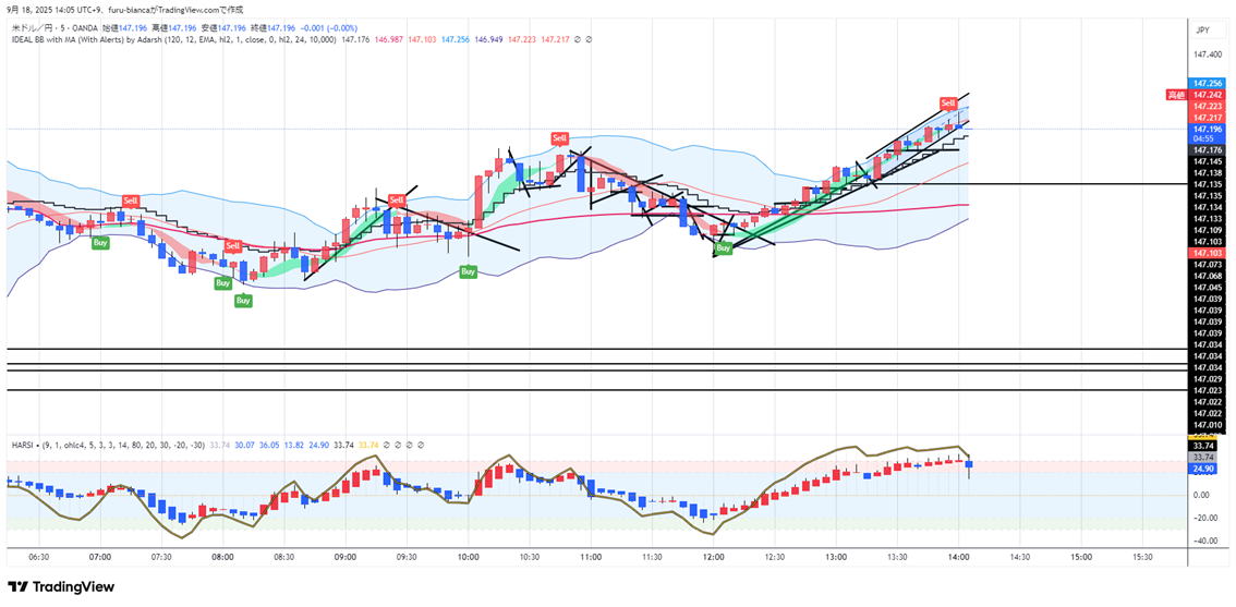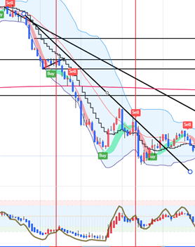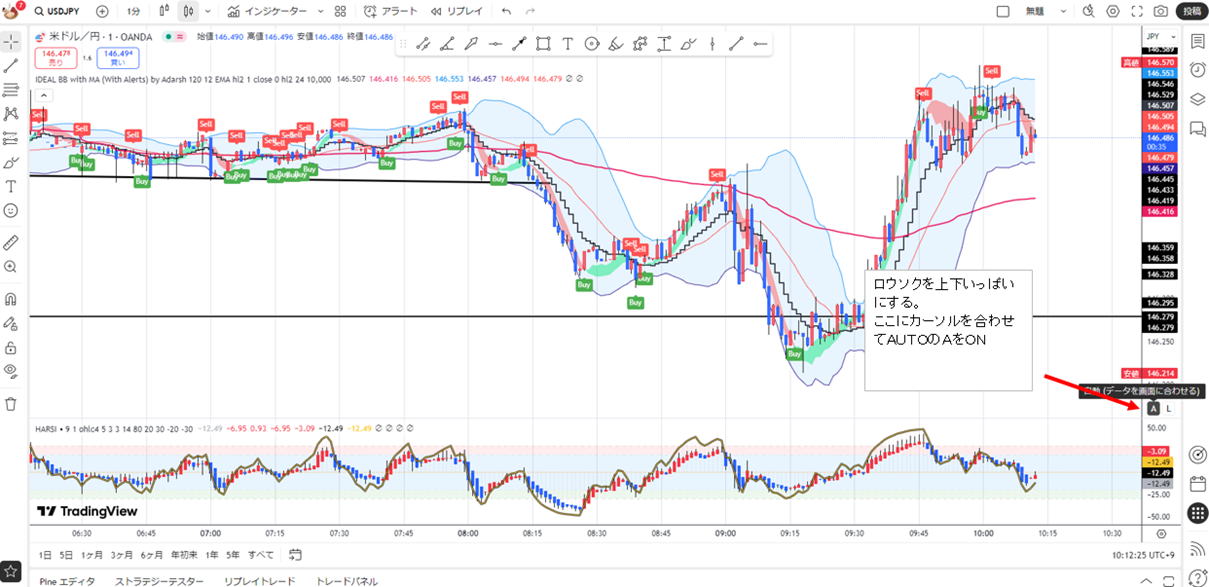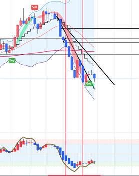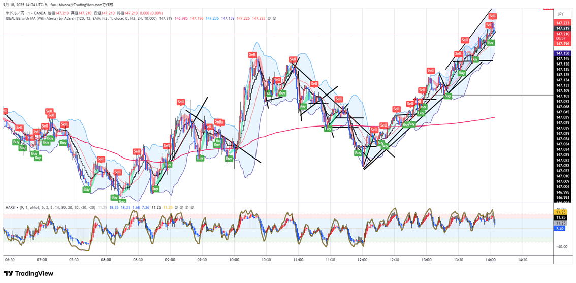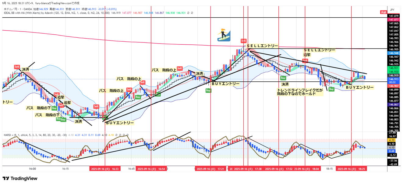 | トレンドに逆らわない インジケーターサインは、おまけ!ロウソク中心に考える。 複数根拠でエントリー&利確 トレンドを把握するには以下の手順です。 ① 環境把握 チャート全体を見る。座標確認です 上位足も見てください。 上位足とずれていれば短命です。 水平線・トレンドラインを引き、インフィールド内にいるかいないか。 インジケーターの状況 ②予測するが反対も考えておく ③発射ボタンを押す信号を考えて訓練しておいてください。 やっても良い所はトレンド2つだけ 上昇相場 パーフェクトオーダーが最高 2本ダブルでもOK 下降相場 同上 やってはいけないトレンド1つ 3本レンジ相場 短い幅で上下を繰り返すゼブラトレンドはやらないでください。 急上昇下落 お薦めのインジケーターを使用 IDEAL BB with MA (With Alerts) ![]() IDEAL BB with MA (With Alerts)をおまけで使います。デフォルトです 基本は、エントリーサインが出ます。。 このインジケーターは優秀と思いますが、あくまでおまけで気づきを認識する程度で他の根拠と一緒にトレードします。 調整で短くすることもできますが、あまり短くすると階段がロウソクにべったりくっつくので見にくいですのでデフォルトのままです。 チャートは3時間の幅にいつも固定しています。 高さを固定したいのですがはみ出ますので特に制限はしていません。ボラ(ロウソクの長さ)が出るように出せば分かり易いです。 またロウソクが隠れ出したらAを外して調整してください。 ![]() 基本は、トレンドラインブレイク・水平線ブレイクでエントリーしますが、その真偽性をインジケーター:IDEAL BB with MAで行います。 その逆でサインを全体のロウソクとトレンドライン・水平線で判断しても良いです。またラインブレイクでエントリーを追加しても良いでしょう。 これには、私が必要とする制御のプログラムは組み込まれていません。傾向としてそういうものはないので自作で作るしかないが大変困難で不可能です。 プログラムの経験がある方、これからがっつり行きたい方はやってください。 通常の好きなインジケーターを入れて、メリットデメリットを分けて使うのがベストです。 レンジ 後からチャートを見てレンジだって分かるんですが、トレード中は迷います。突入時は特に全く分かりません。だましかなとも思いますが 誰にも分かりません。様子見するしかない。それは不安定その物だからと思えばいいです。 いくつかのヒントトレンドラインインフィールド、階段の上下 レンジになれば、信号を出さないとか、急変動などやってはいけないのサイン トレンドラインのインフィールドならサインを出さない。出したらSELLBUYじゃなくて追撃しろとかはならないんです。 プログラムは所詮計算式ですから、レンジ相場では、信号多過ぎで出ます。 その時は5分足にするなどにして考え、サインを減らします。 トトレンドラインブレイクを正確に表示するプログラムは見たことが無いです。自分で引いてください。 そして信号の診断をします。角度のない時は、トレンドの命も短いもんです。 トレンドラインの引き方も勉強してください。押し目でずれるのが普通です。継続すれば元から引き直してもいい ずれる時はチャネルラインで、半分は上 半分は下の世界出見てもいいです。 これは、センスの問題で、慣れるしかないです。最低2点でトレンドライン 接点がなく反転する時はクラスタラインと区別しましょう。 クラスタラインが反復すれば、トレンドラインは横滑りとなりレンジと認識できます。 トレンドラインがぶつかったからって言って反転だとはすぐには分からないです。 バイナリならパターンクラスタラインの反復でチャンスですがFXはダメです。 トレンドラインブレイクですが綺麗に反転してこれぞブレイクだと分かることもありますが、VAか横滑りかは、半々で普通は横滑りになると思った方が良いかもです。 VA反転は珍しいと言うかありがたい思った方が良いです。 常識あるトレーデーの記事で、ピークではやらない、やって勝つこともあるが負けるとリズムがなくなる よって肩抜けから始めるとありました。 天井や底で大きなレンジになると、方向性の勘違いもあるので注意してください。 また、思った作戦と逆になれば損切してください。100%当たりませんから。スラッジもありますから。 なんでこんな絶好の良きにドカンガあるのか分からねえなと思うこともよくありますが止めればいい 理由もなく踏ん張ってしまうと負けます。 イメージ ![]() 押し目ならホールドまたは、反転か 一番難しい所です。 人によって違います。ここでは1分足で分析。 反転か押し目かの判別は、なかなかむずいです。見ただけじゃ判別がつきにくいので、ラインを引いて2-3分見るしかないです。 ブレイク判定 最終ろうそくをブレイク 階段線20MAラインをロウソクがブレイク 肩抜け となります。ここで新しいエントリーは止めておきましょう。 確実なのは、肩抜け