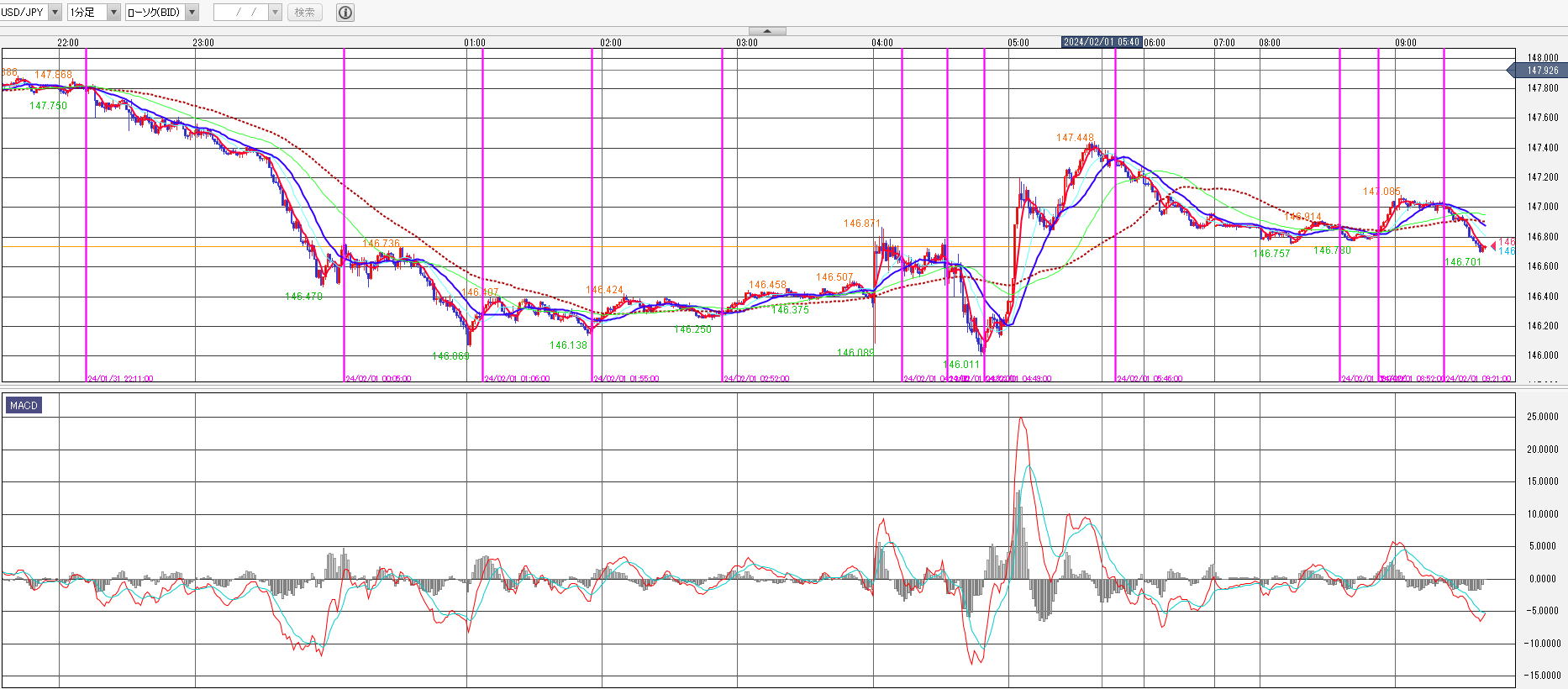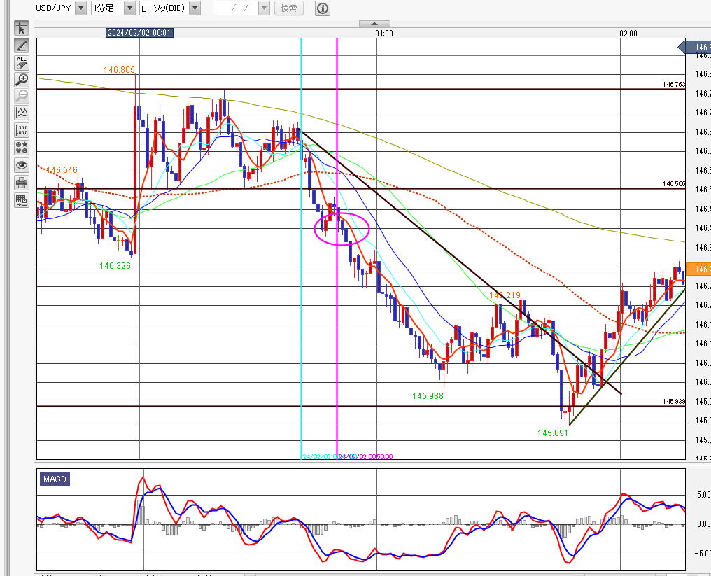 いろいろ考え方があります。 5分足のチャートを見ます。 1. 縦線は、1分足でのMACD信号に印をつけます。 1分足でMACDのデッドクロスが出ました。空色の丸をマーキングしました。 2. トレンドラインのインフィールドかどうか MACDのラインでは平行をキープしてデッドクロスしていません。 期間のある分反応が遅いので信号が出ない。遅れることによって流れがうまい具合に 方向性を出します。 1分足だとブレを拾ってしまいます。 じゃあ最初から5分でやればいいじゃんと言われそうです。 確かにそういうYOUTUBERもいます。 確かにそうですが時間的にチャンスが少なくなります。 トレンドの出発は勢いのあるブレから始まるときが多いのでエントリーご5分足でもよく観察してください。 どっちなんだと悩むと思いますが、基本は5分、エントリーの時だけ1分足で見ます。 理由は1分足だとチャンスが多いからです。1分足では、すぐに戻って決済前プラスが減ったり消えたりします。 でも繰り返せば、そのうち波に乗れるものです。波は、大波小波あり、分かりませんが すくなくとも一個の山谷超えて行けば波に乗れるので5分足と1分足を見て トレンドラインをせっせと引き直して、無理せずルール通りに 1分足チャートと5分足チャートを比べましょう。 この時信号が一致しているか見ます |