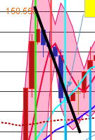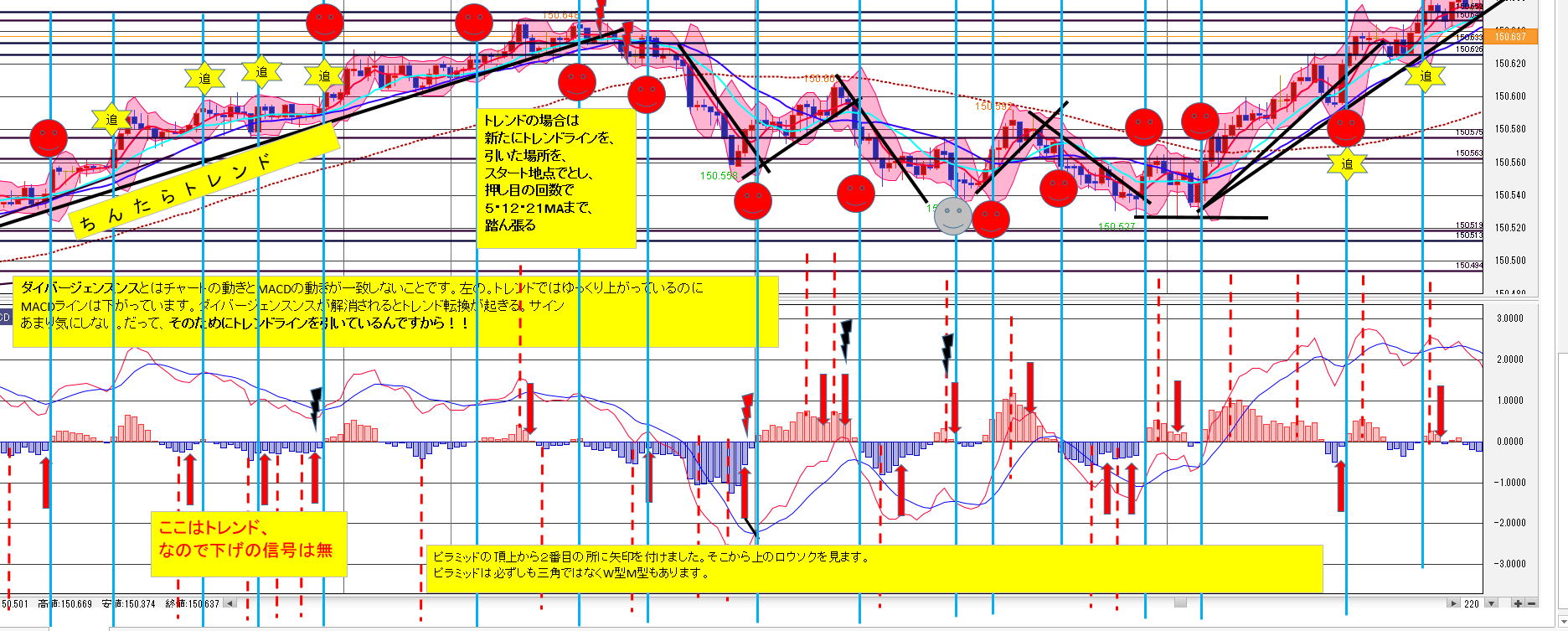ダイバージェンスの探求 黒の縦線は信号のタイミングで信号が出たところを分かり易くしている線となります。 最初のピンク丸部分 ろうそくは下がっているのにラインは上昇 =>これは勢いを失ってきつつある姿であるので追撃どころか引き上げの準備 二番目の空色の丸部分 =>本来ならここで上昇から下降になっているので 転換が起きているので信号が出るはずですが、山があっても信号は出ていません。 ヒストグラフの山はロウソクに準じた形を形成しています 原因はいくらMACDでも急激な値動きにはついていけないということでしょうか ピークの転換でMACD信号が無い時は注意 MACDのヒストグラムの棒の長さが 三番目の緑の丸部分 =>MACDラインがシグナルラインを抜かないでそのまま平行に進んでいる こういう時は100%我慢して次の流れにのらないといけない。 5MAの抜けサインもないし、ラインの角度も下向きではない。 天井や底の空打ち まさにバカになる。役に立たないことです。 レンジが続いたり、駒で形成されたぺっちゃんこトレンドでよく出ます。 MACDはあくまで勢いですので勢いがないとアホになります。 トレンドラインで見定めます。 1分足では、片道が10本以内でシングルトレンドまでは、2点を結ぶような トレンドラインが引けませんのでできません この場合は、ロウソクの流れを見ながら、 5MAの抜けかMACDのシグナルで判断します。 棒山が下がったら曇り棒のピークから3番目で雨が降る。 まあダイバージェンスンスをおおっと見っけたとなったら ダイバージェンスンスなくたって山がふもとになれば もうすぐ雨が止む。転換2分前と思ってください。 ホールドしていれば決済タイム そして0水準00せんべいが、せんべいなくして反転の棒でエントリー 押し目でも深ければMACDは反応して出ますがトレンドラインのインフィールドにいればパスしてホールド または追撃してください。MACはなんちゃっておせんべいとなります。 下にも記載してあります |