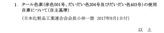 2024/3/22 タール色素 (赤色219号、赤色220号、赤色225号、赤色227号、赤色401号、 赤色504号、かっ色201号、黄色205号及び黒色401号)における 特定芳香族 アミンの管理値設定(自主基準)の発出について 今般、日本化粧品工業会から、別添のとおり、 タール色素 (赤色219号、赤色220号、赤色225号、赤色227号、赤色401号、赤色504号、かっ色201号、黄色205号及び黒色401号)における 特定芳香族アミンの管理値を設定する自主基準を制定した旨の連絡がありました. |