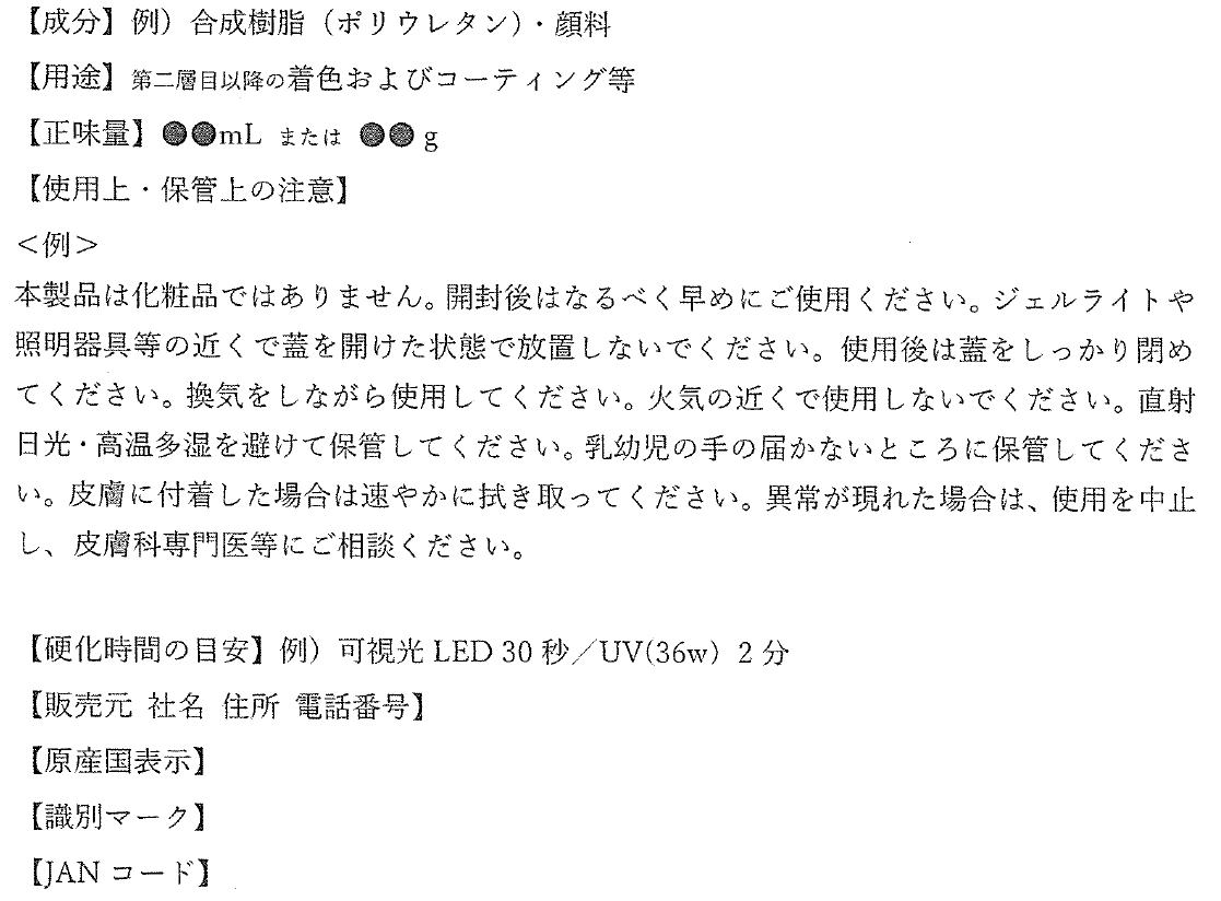 2薬第468号 ベースジェル以外は雑貨とのこと カラージェルやトップでも直接も塗れるとある場合などの紛らわしいのは化粧品 雑貨の場合は、爪に直接塗ってはいけない、{雑貨}と記載 すでに正規のものは爪化粧料と書く。当然書いてあると思いますが ![]() 記載例 日本ネイリスト協会の案内もご覧になってください。 |