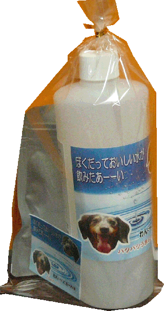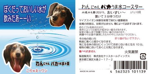 わんにゃんバカうま水の素 飲用ボトル+活力石+コースターセット 2013/11/23販売開始=>販売終了 なんと・置くだけで 犬も人も喜ぶおいしい水(活力水) このおまけのコースターで、日本酒もうまくなります。 石を入れたポットに水を入れるだけで 水に混じっている苦味成分のカルシウム・マグネシウムを 吸収し、おいしい山の水を再現します。 ミネラルがたくさん水の中に解けると 水はまずく苦くなるのです。 所品パッケージ内容 リアルな画像は、左の写真をクリックしてください。 2500円税込み おまけのコースターは、置くだけで触らずして3分でおいしい水をペットに飲ませられます。 健康維持製品です。カルキ臭が消えます。冷たくもOK ボトルと石のセットもあり、水を注ぐとコースターよりさらに、カルシウムやマグネシウムの少ないおいしい水ができます。 500個以上ならOEMで製作ができます。 お問合せはメールでお願いします。=>furu@chrishd.co.jp |