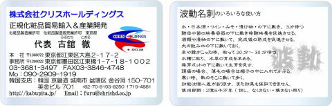 活力名刺WAVE MOTION NAME CARD 汎用コースターの1.5倍の面積でそれなりの威力発揮 こんなコースターをもらったら絶対に無くさないし、大事にします。 周囲の方にたくさん自慢が出来ます。 小売りは、100枚単位 一枚400円 超高級な名刺ですので誰でもあげられるものではないでしょう。 印刷用紙はコピー紙ですが、 ![]() 2012/12/01から弊社では、この名刺を採用致します。R4mm弊社の名刺 Our company's name card |