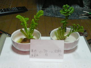 水道水(左写真2枚):根元がどす黒く死んでいる。 ライザブ水:こちらは白い部分がきれいなまま |