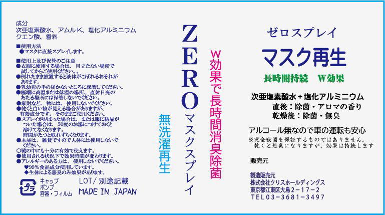 マスク除菌スプレイ .html長時間に無臭・除菌が持続 ゼロスプレイ スプレイして除菌・乾くとまた除菌開始 しくみ 1 次亜塩素酸水で強力除菌 乾燥後 2 塩化アルミニウムで雑菌繁殖防止 既存のマスクの性能を飛躍的に伸ばす除菌スプレイ(無臭) 次亜塩素酸水でまずは一撃 口から出た口臭も10分外せば無臭になります。 6時間が目安です。もう一回スプレイしますとまた使用できます。 翌日完全無臭しかし、塩化アルミニウムのちからで雑菌繁殖防止 ノンアルコールなので車の運転も大丈夫です。 成分は、次亜塩素酸(Ph7.3)+食品用塩化アルミニウムであります。 塩化アルミニウムは、もともと食品添加物なので舐めても害はありません。 ガラスのような硬いものには向いていません。 また、黒い洋服にかかりますと漂白作用のあと有効成分の結晶がでてきます。 白い下着や靴下・靴・剣道防具の内側にも効果が期待できます。 乾くと白い結晶が出ますがお湯で洗うと簡単に取れます。 マスクのブームが去った後は、靴に使用してください。 乾けば、悪臭が消えます。 30mL500円 標準希望小売価格 OEM専用です。小売りは相談 お問い合わせ Email furu@chrishd.co.jp Yahooメール、フリーメール、携帯ドメイン指定の場合は、受信出来ない場合があります。迷惑メールに入れられ、自動削除される場合があります。 また弊社からのメイルが届かない場合があります。研究目的のお問合せはご遠慮下さい。 |